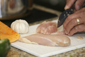 Purchase skinless chicken or remove the skin before eating since half of the calories are